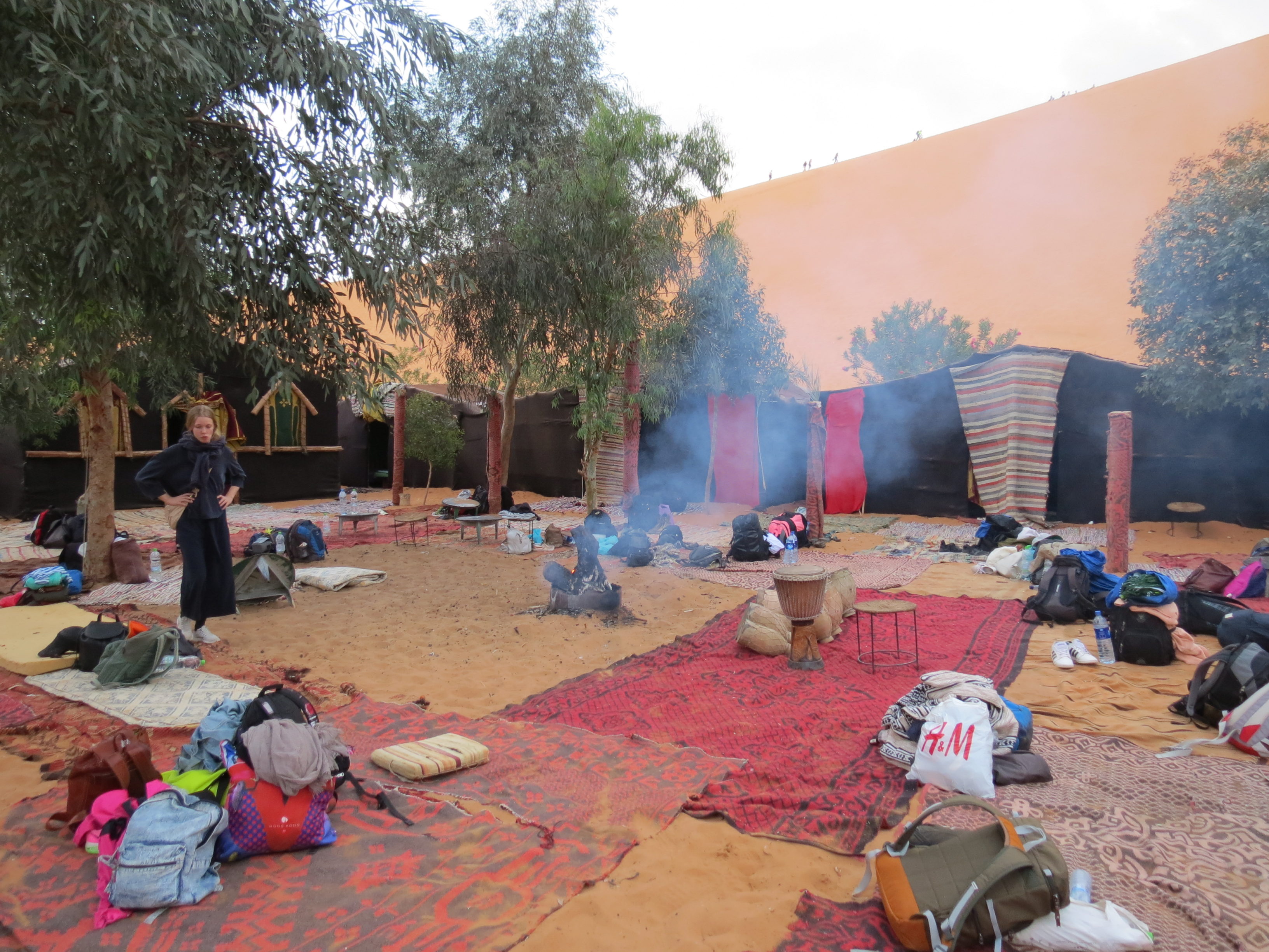 La cena si prende nella tenda più grande, attorno ad un unico tavolo. Si condivide il pane, la carne speziata e la verdura; si parla e ci si conosce. C’è chi è australiano, chi è greco e vive a Londra, chi è americano e non sopporta gli americani e chi è berbero ed è nomade da sempre. Il freddo aumenta e così il buio diventa sempre più nero, ma la luce non muore, sopravvive, si trasforma. Al centro dell’accampamento qualcuno sta accendendo un fuoco e le prime fiamme, nitide, emergono. È un richiamo e la gente si avvicina. Gli Imazighen, gli uomini liberi, hanno portato con sé tamburi, chitarre e flauti: si aprono le danze. Il silenzio è spezzato dal ritmo fervido dei canti che si insinua sotto la pelle cancellando ogni imbarazzo e scatenando balli intorno alle fiamme. Il sonante battere delle mani, la sabbia fredda sotto i piedi nudi e le risa incontrollate plasmano l’atmosfera, tanto da sfiorare il tribale. Lascio la festa prima che si spenga per ricordarmela solo così, viva e trascinante. In realtà c’è altro che mi aspetta, un spettacolo speciale a cui voglio assistere. Alzo lo sguardo ed è indescrivibile, vedo frammenti di luce nel manto nero: è il cielo del deserto. Si intravedono a fatica le creste delle dune accarezzate dalla lieve brezza notturna. Mi distendo, affondo le mani nella sabbia soffice e i miei occhi si perdono nel firmamento. Il pensiero si interrompe, non mi interessa elencare i nomi delle costellazioni o elaborare qualche pensiero esistenzialista sull’essere quasi nulla nell’immenso tutto. Semplicemente sono, vivo la mia esperienza senza filtri, abbandonando anche me stessa.