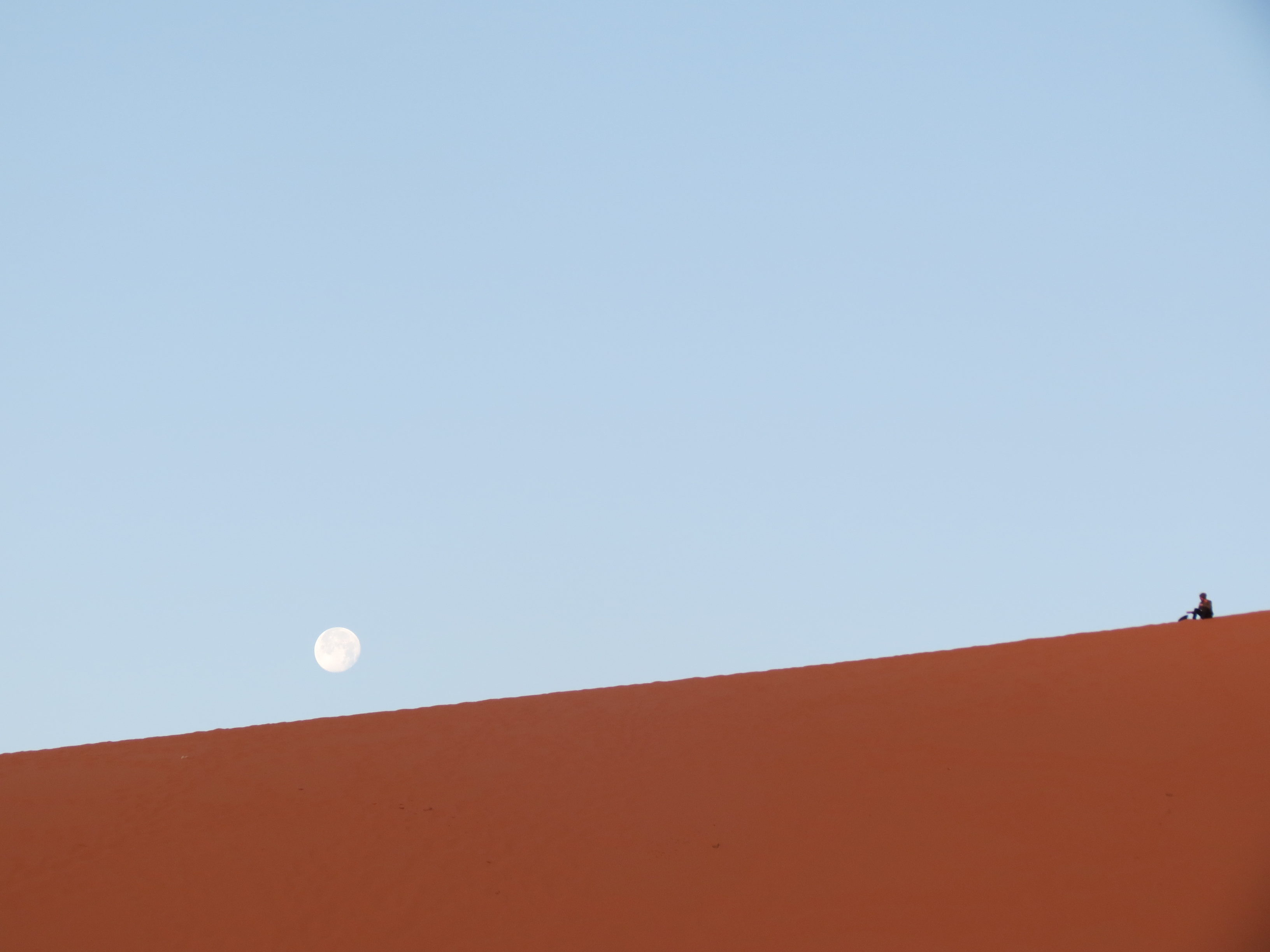 Delle morbide dune neanche l’ombra, il viaggio è ancora molto lungo. Le interminabili ore si susseguono faticosamente tra la pesante aria senza nuvole e le lande desolate, finché l’arida steppa inizia a macchiarsi di rosso. Colline di sabbia fanno capolino sul confine tra cielo e terra. Sono a Merzouga, la porta per l’Erg Chebbi, il deserto sabbioso.